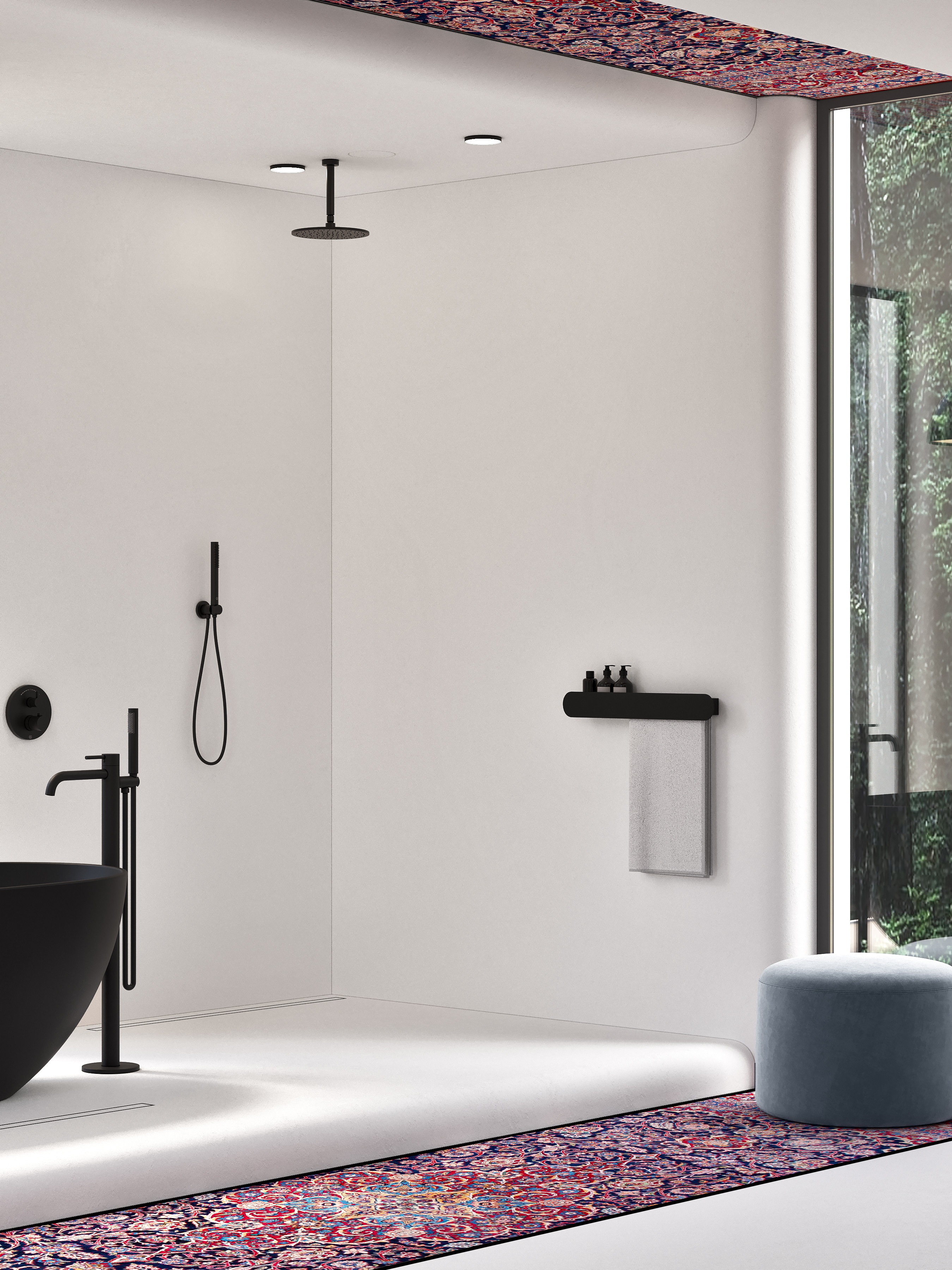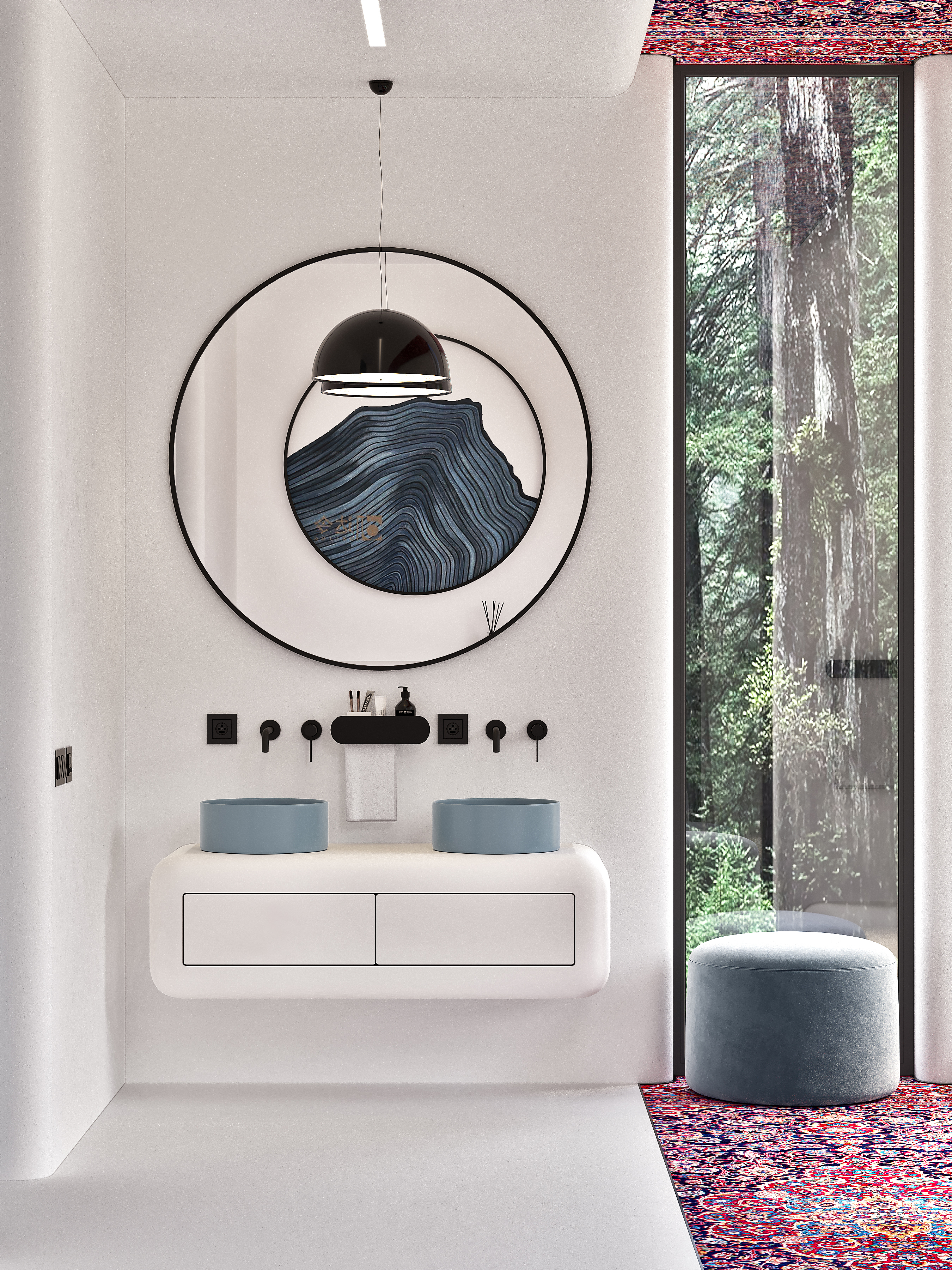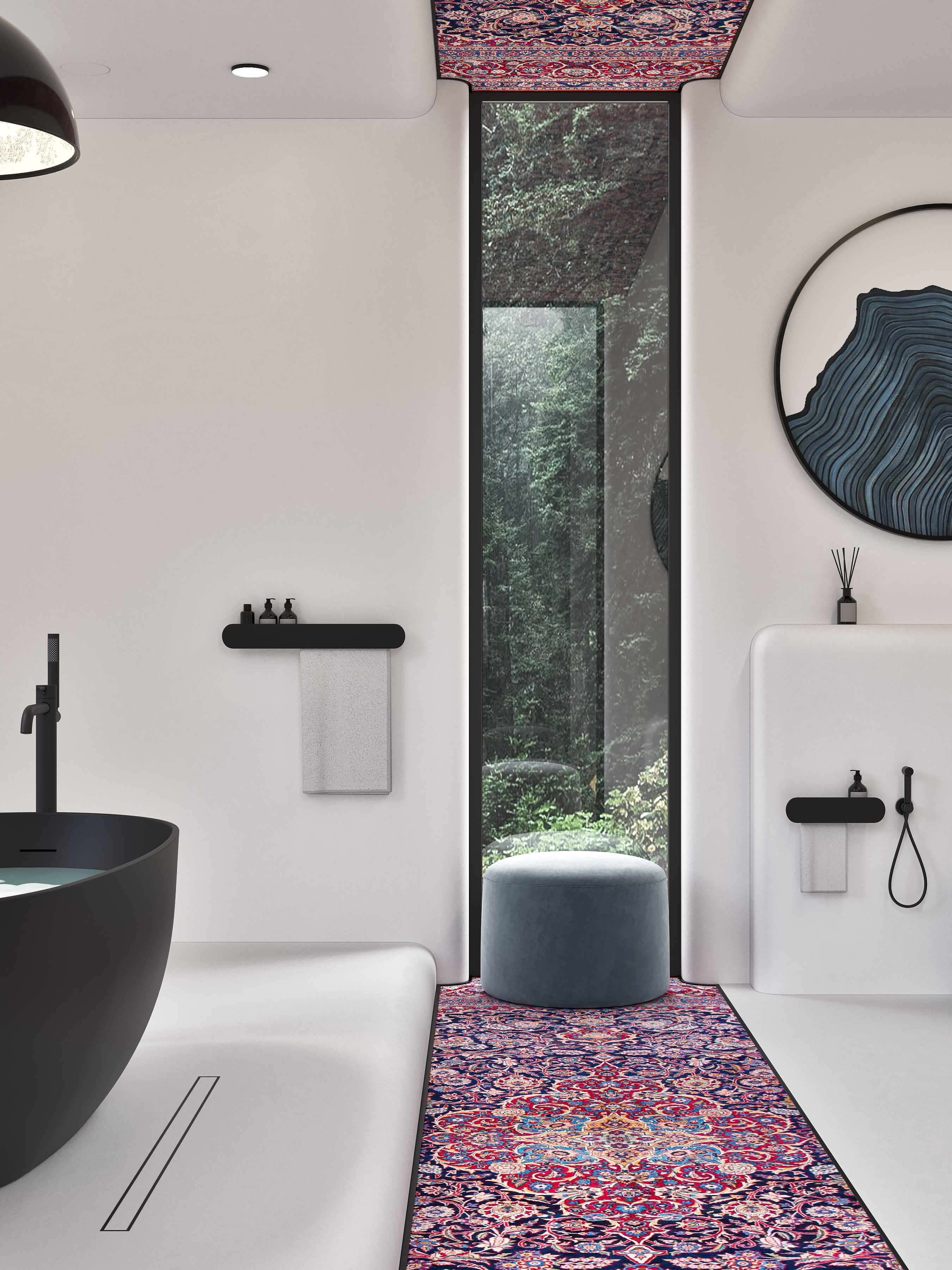 Радиальная форма внешних углов, белый и чёрный цвет в сочетании с яркими, акцентными элементами задают пространству особую атмосферу. В такой ванной можно легко отключиться от внешнего мира и погрузиться в особую атмосферу.